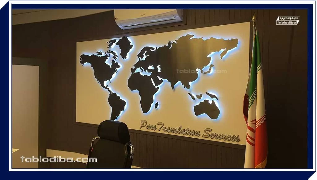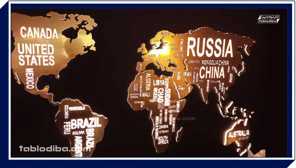با توجه به اینکه تابلو سازی دیبا نقشه جهان را به صورت سفارشی می سازد شما مینوانید این نقشه ها را با زبان فارسی، یا هر زیان دیگر سفارش دهید.
