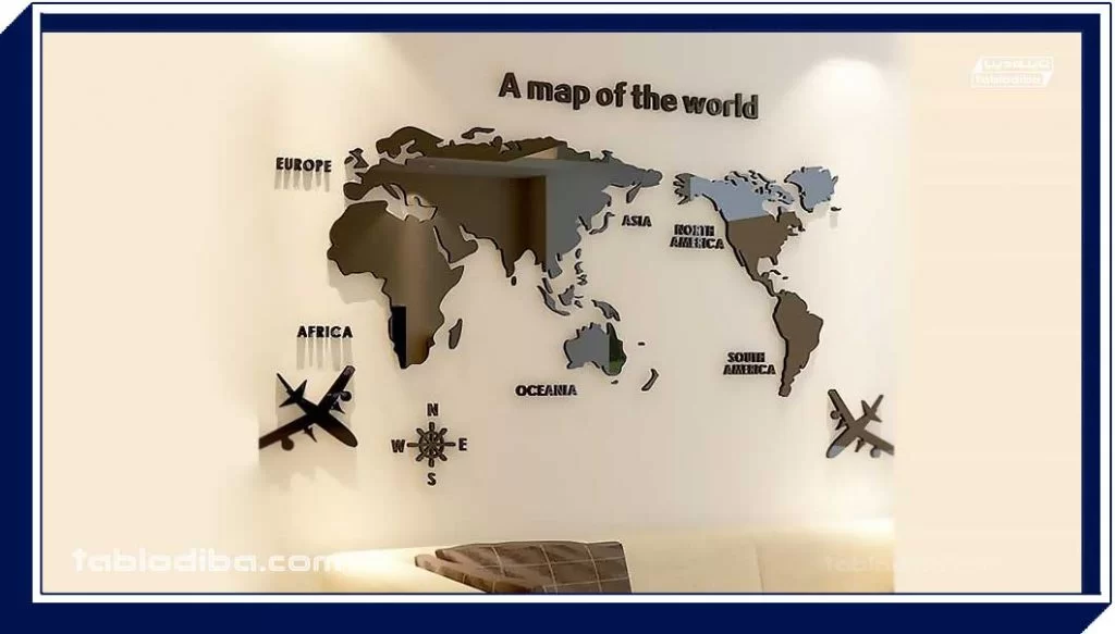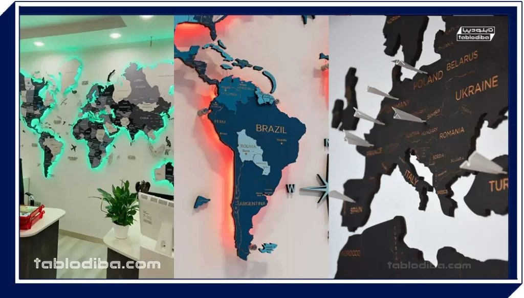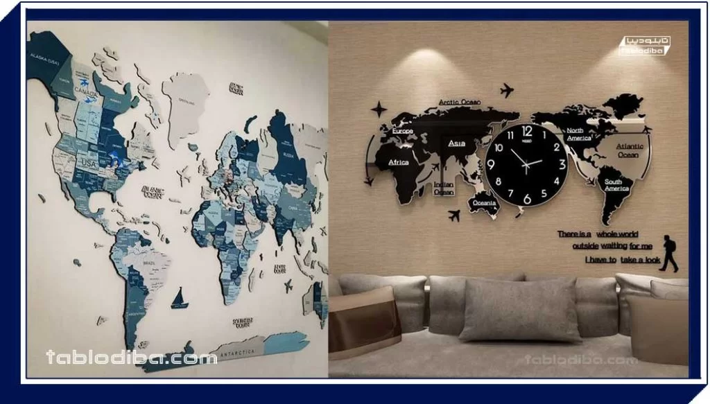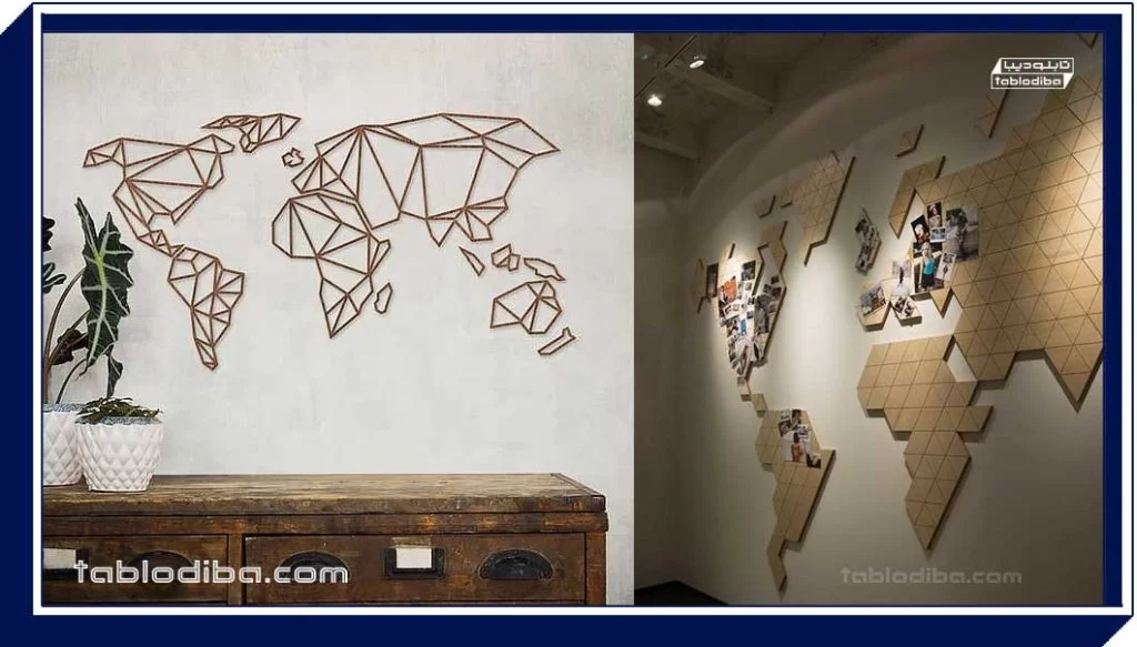 تابلو نقشه جهان یک تابلو از نقشه جهان و قاره‌ها را به تصویر می‌کشد و که برای زیبایی بصری اکثر مکان‌ها کاربرد فراوانی دارد. این تابلو با کلیتی که از دنیا به تصویر می‌کشد اما به طرز ماهرانه‌ای به صورت ظریف ساخته شده است و در دکوراسیون داخلی مکان‌ها به کار می‌رود.