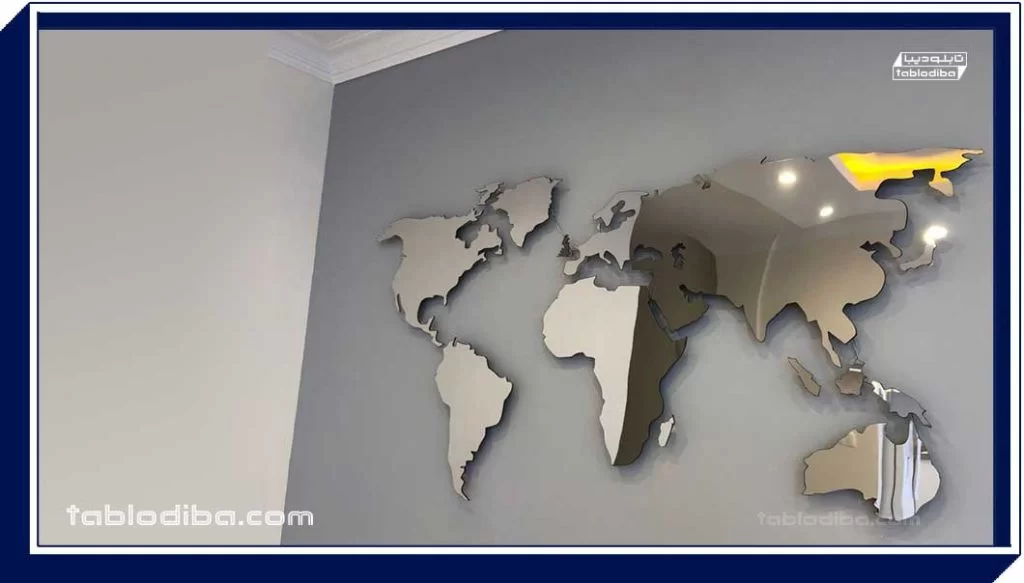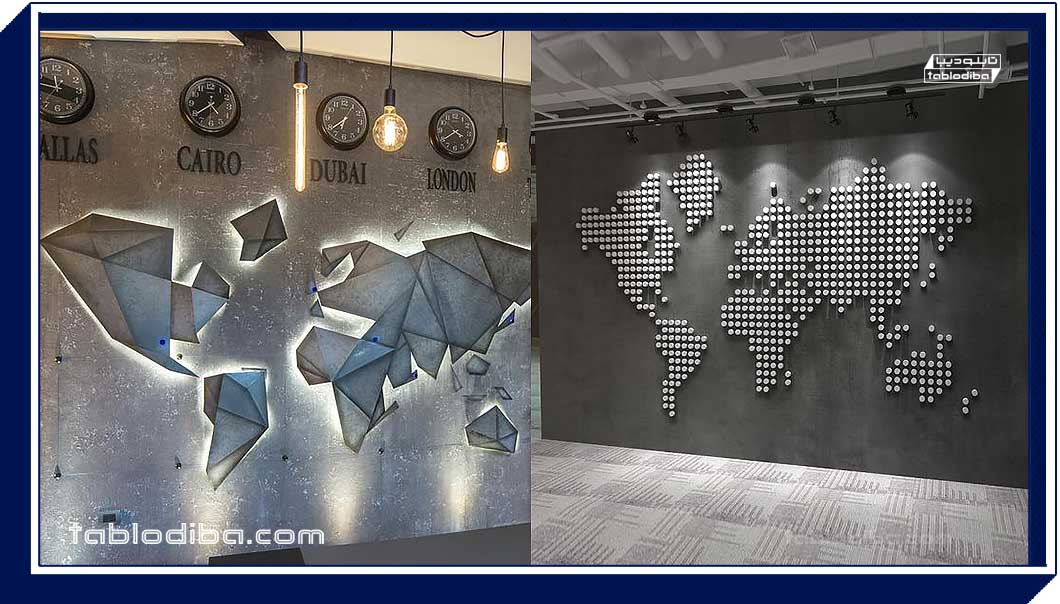 برای ساخت نقشه جهان دکوراتیو از روشهای مختلفی استفاده می شود. این نقشه ها وقتی جذاب تر میشوند که  با نور پردازی همراه شوند. برای ساخت این نقشه ها معمولا از استیل، پلکسی گلاس یا چوب استفاده میشود. البته همیشه استیل یکی از متریال های پایدار و زیبا برای طراحی دکوراسیون داخلی است. تابلو های استیل لبه سازی شده به همراه لایه های دیفیوزر نورانی، جلوه ای از فلزات نورانی است که به محیط کار شما روح جدیدی میبخشد.نقشه جهان را بر روی دیوارها، سقف و یا در کنار چراغ‌های دکوراتیویی قرار می‌دهند.