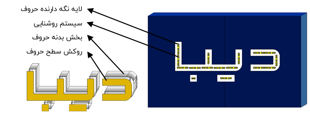 حروف برجسته در تابلو سازی به صورت معمول از چهار بخش اصلی تشکیل شده است: