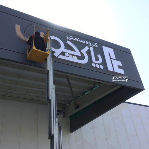 ساخت و نصب لوگوی برجسته استیل در سردرب وردی اداری کارخانه شرکت پاک چوب ایرانیان در شهرک صنعتی پرند تهران